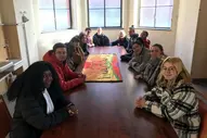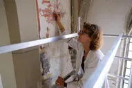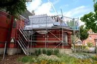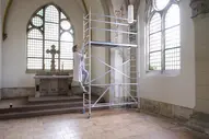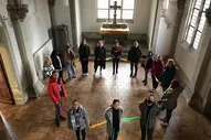 Mit der Grundsanierung und den notwendigen Vorbereitungen für die Restaurierungsarbeiten der Kapelle haben wir begonnen. Das Amt für Denkmalschutz hat den eingereichten Entwürfen zur Restaurierung zugestimmt. Und die denkmalrechtliche Genehmigung erteilt. Nun kann mit dem Umbau begonnen werden. Das Herzstück des Zentrum Würde wird die Begegnungsküche, die derzeit ebenfalls Gestalt annimmt. In ihrem Mittelpunkt befindet sich eine sechs Meter lange Massivholztafel, an der zwölf Personen Platz finden. Sie wurde von der Jugendwerkstatt der Mehrwerk gGmbH gefertigt.