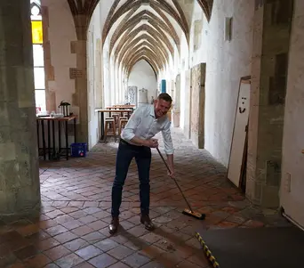 Eine erste Starthilfe gab es nun von Mitarbeitenden der VW FS AG: Olaf Podschadli, Leitung IT Programs, Architecture & Transformation, und zehn Mitarbeitende unterstützten das Kreuzgang-Team wieder bei den Vorbereitungen. Denn ganz zu Anfang war erst einmal „Frühjahrsputz“ angesagt: Von der Küche bis zum Innenhof wurde gefegt und gewischt, die Möbel und Beschilderungen aufgestellt und angebracht sowie der Garten auf Vordermann gebracht. „Wir suchen uns jedes Jahr Projekte aus, bei denen wir unterstützen können. Ich freue mich deshalb sehr darüber, dass wir wieder im Café Kreuzgang aktiv sein können und so viele Mitarbeitende sich freiwillig für dieses einmalige Projekt engagieren. Und dazu eröffnet das durch die tollen Begegnungen, die wir haben, für alle den Blickwinkel“, erklärt Podschadli. Vanessa Pechau und Susanne Ihlau freuten sich über die vielen helfenden Hände: “Bereits im vergangenen Jahr haben uns Herr Podschadli und sein Team beim Aufbau unterstützt. Herzlichen Dank für Ihre Hilfe!”.