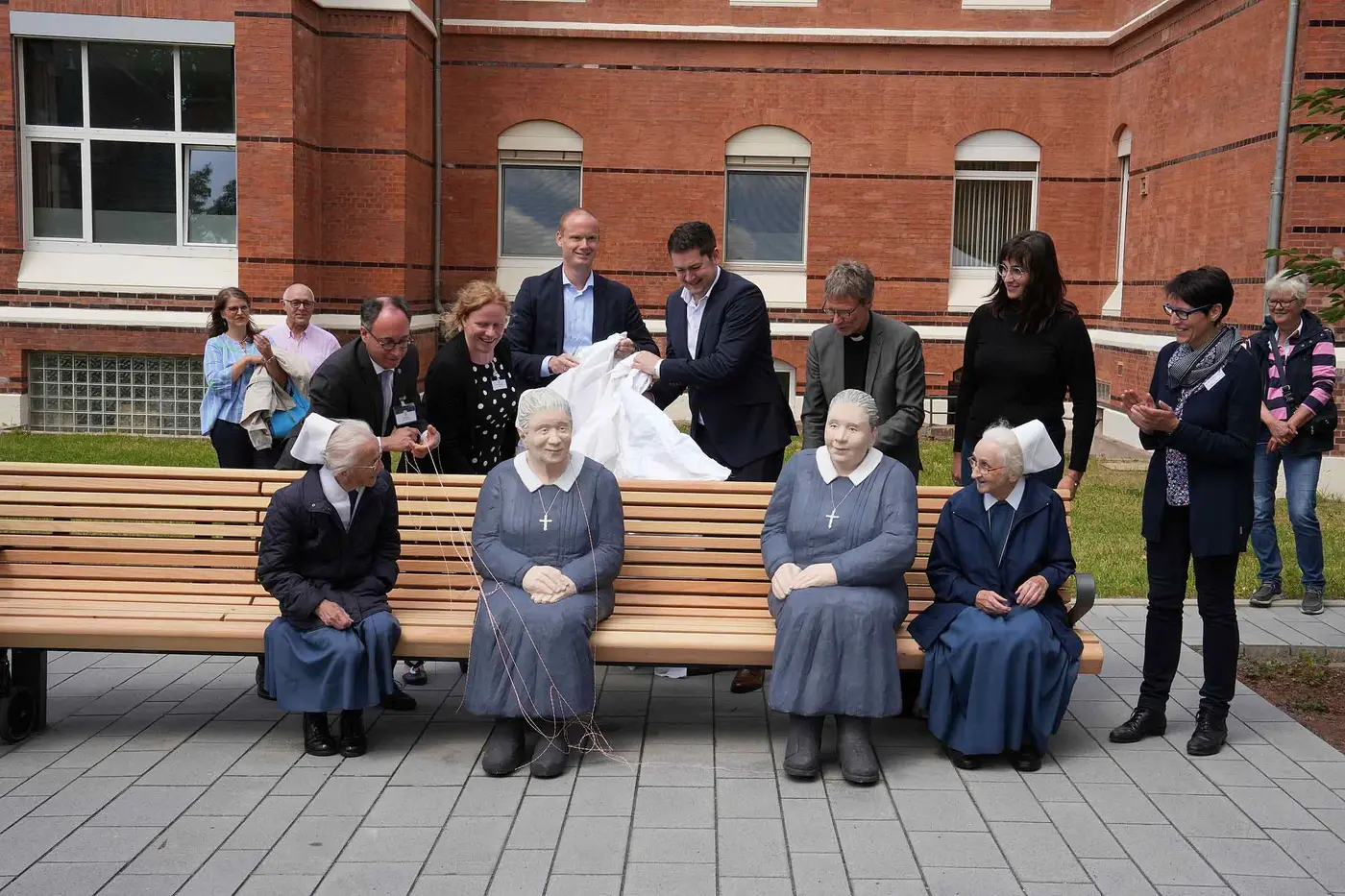 Den ganzen Tag saßen sie eingehüllt in ein großes, weißes Tuch und wenig beachtet auf einer Bank, nun werden die Schnüre feierlich durchtrennt: Zwei Diakonissen-Figuren der Künstlerinnen Christel und Laura Lechner begrüßen zukünftig Mitarbeitende, Patientinnen und Patienten und Gäste mit einem Lächeln vor dem Eingang des Neubaus. Schwester Christa und Schwester Dorothea, die beiden letzten Diakonissen, nehmen neben ihnen auf der Bank Platz. Wie sie sie denn finden, ihre beiden neuen Mitschwestern, werden sie gefragt. „Ein wenig groß vielleicht“, antworten sie lachend.