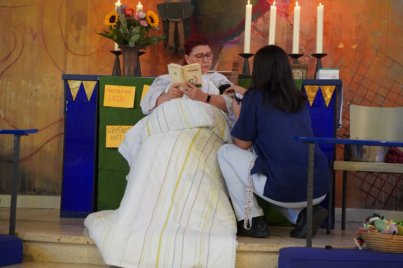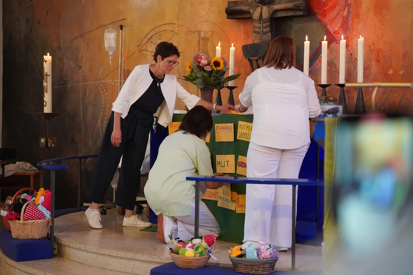 Um einen ersten Einblick davon zu bekommen, welche Aufgaben als angehende Pflegefachkraft auf sie zukommen, hatte ein älterer Ausbildungsjahrgang kleine Theaterszenen vorbereitet und im Rahmen des Gottesdienstes gezeigt. Gemeinsam mit Heike Heckmann brachten die Schüler:innen außerdem Karten am Altar an, auf denen zu lesen war, was sie den neuen Azubis wünschen: Mut etwa und Kreativität sowie Respekt und Durchhaltevermögen, Geduld und Gemeinschaft.
