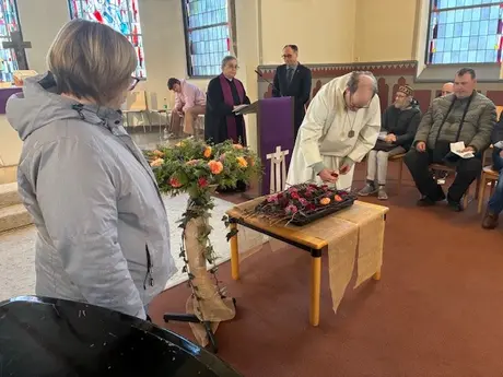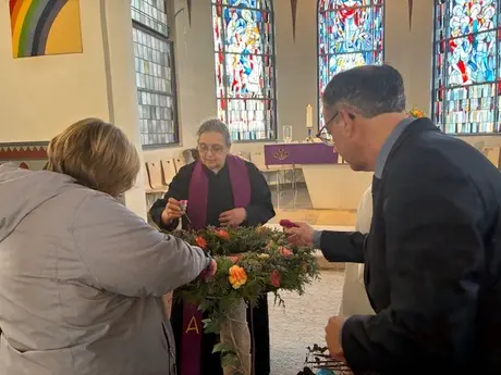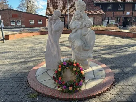 Zur Erinnerung an die 180 Bürger:innen wurden symbolisch Blumen in einen Kranz gesteckt, der im Anschluss an den Gottesdienst an der Gedenkskulptur auf dem Dorfplatz niedergelegt wurde.