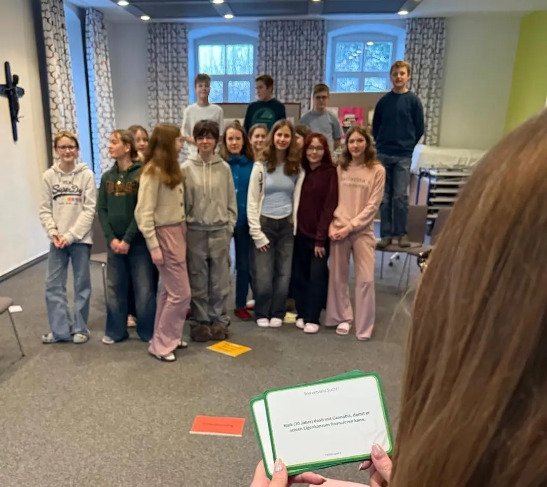 Im Baustein „Zahlen, Daten, Fakten“ beschäftigten sich die Schüler:innen spielerisch mit der Verbreitung von Abhängigkeitserkrankungen in Deutschland. In einem „1-2-oder-3“-Spiel schätzten sie Zahlen zu verschiedenen Suchterkrankungen und kamen darüber ins Gespräch. Anschließend wurde thematisiert, wie viele Kinder in suchtbelasteten Familien leben und warum es wichtig ist, Sucht offen anzusprechen und nicht zu tabuisieren. Ziel war es, ein Bewusstsein für das Thema zu schaffen und Vorurteile abzubauen.