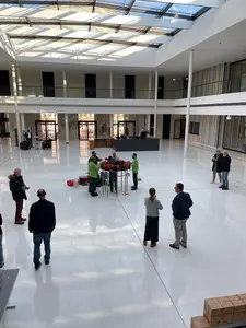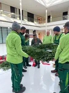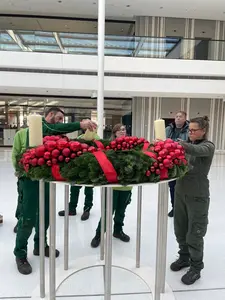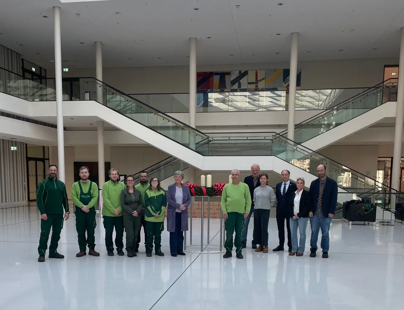 Anliefern, aufstellen und schmücken - mittlerweile sitzt bei den Grünwerkern jeder Griff perfekt und die einzelnen Arbeitsschritte gehen fließend ineinander über. Innerhalb von 45 Minuten konnte der Kranz, der in der Mitte des Forums im Niedersächsischen Landtag aufgebaut ist, durch die Landtagspräsidentin Hanna Naber abgenommen werden. „Ihr Besuch läutet den Beginn der Adventszeit ein - und dazu gehört ein Kranz, den sie uns jedes Jahr vorbeibringen. Herzlichen Dank! Damit hinterlassen Sie Spuren und zeichnen ein buntes und vielfältiges Bild im Landtag, der ein Haus für alle Menschen ist", freut sich Naber. „Danke, dass wir hier sein und den Adventskranz in den Landtag bringen dürfen. Sie haben vor anderthalb Jahren auf unserem Stiftungsempfang die Festrede gehalten und gezeigt, wie viel Herzblut Sie für die Eingliederungshilfe haben. Heute braucht es in der Eingliederungshilfe mehr denn je Unterstützung und Begleitung aus der Politik. Und es kommt darauf an, Fürsprecher zu haben. Für diesen Wunsch steht der Adventskranz auch in diesem Jahr”, erklärte Tobias Henkel, Vorstandsvorsitzender des Unternehmensverbundes Evangelische Stiftung Neuerkerode. Der Werkstattrat machte in einer kurzen Ansprache auf verschiedene Themen aufmerksam. So waren unter anderem das Thema faire Bezahlung in Werkstätten für behinderte Menschen ein Thema sowie der Wunsch nach mehr Arbeitsplätzen auf dem ersten Arbeitsmarkt.