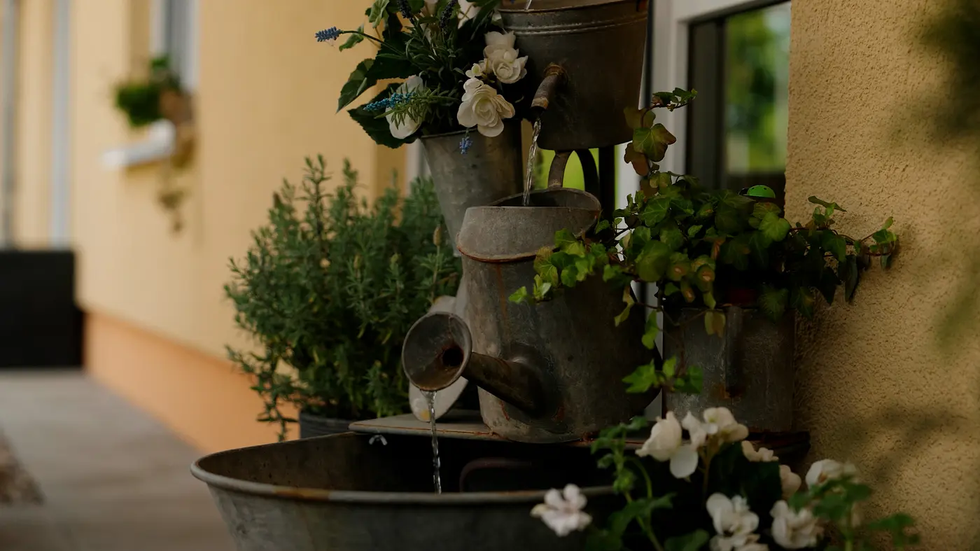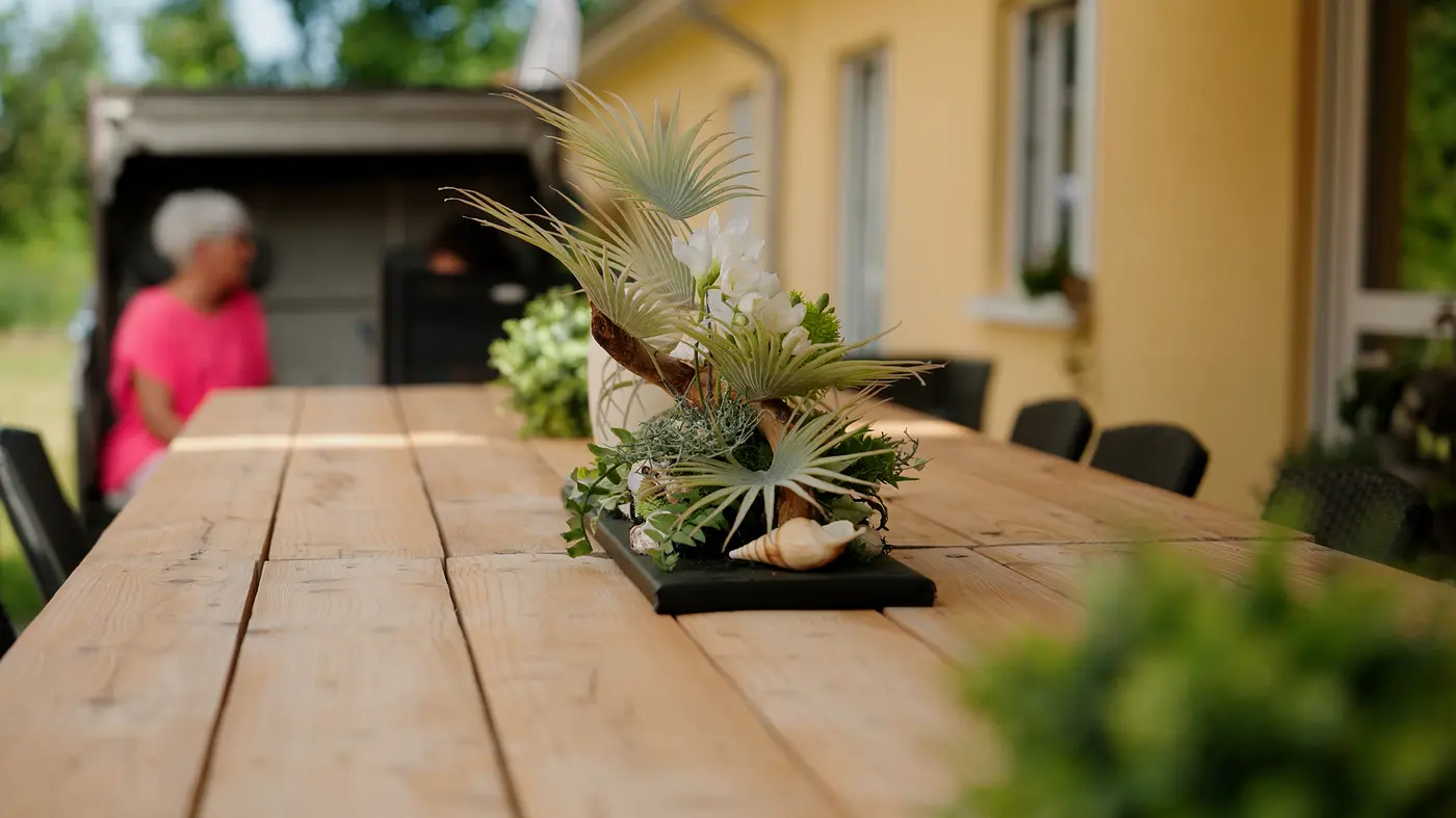 Auch draußen hat sich viel getan.Auf der Terrasse der Wohngruppe steht heute ein großer, massiver Holztisch – dekoriert mit kleinen Blumen- und Muschelarrangements, die Maren gemeinsam mit den Bürger:innen liebevoll zusammengestellt hat. Daneben ein gemütlicher Strandkorb, überall Gartenkräuter, Pflanzen und eine Gießkannenpyramide, aus der leise Wasser plätschert.