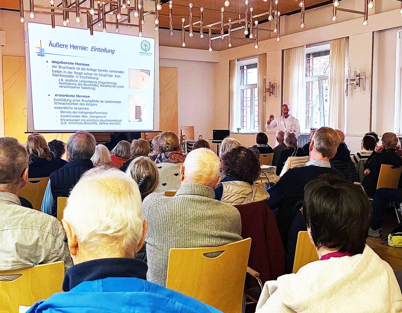 Ekkehard Möbius, Chefarzt der Klinik für Allgemein- und Viszeralchirurgie, sowie die Oberärzte Feras Salem, Oleksii Bondarenko und Jareer Ahmad haben die unterschiedlichen Formen von Bauchwandbrüchen und die heutigen Behandlungsmöglichkeiten vorgestellt. Im Anschluss standen sie für Fragen aus dem Publikum zur Verfügung.