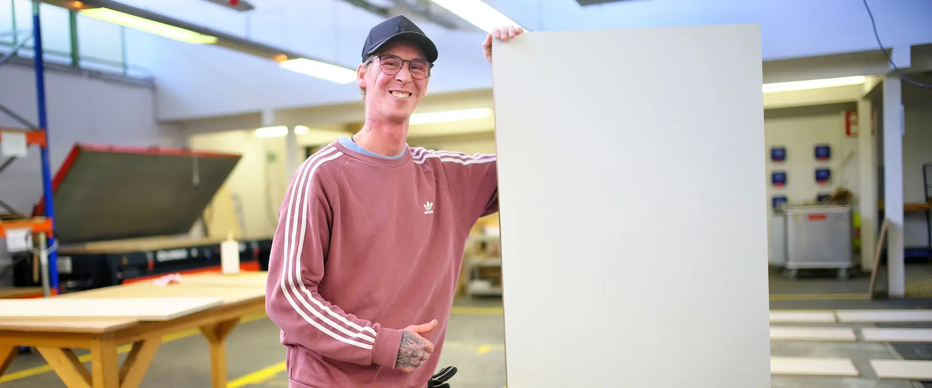 Mitten in der weiten Halle des Kuba Bildungscampus in Wolfenbüttel, dem multiinklusiven Bildungs- und Beschäftigungsstandort der Mehrwerk gGmbH, steht Mirco Meyer. Der Produktionshelfer aus der Tisch- und Holzproduktion geht die am Gruppenleiter-Container angepinnten Aufträge und Skizzen durch.