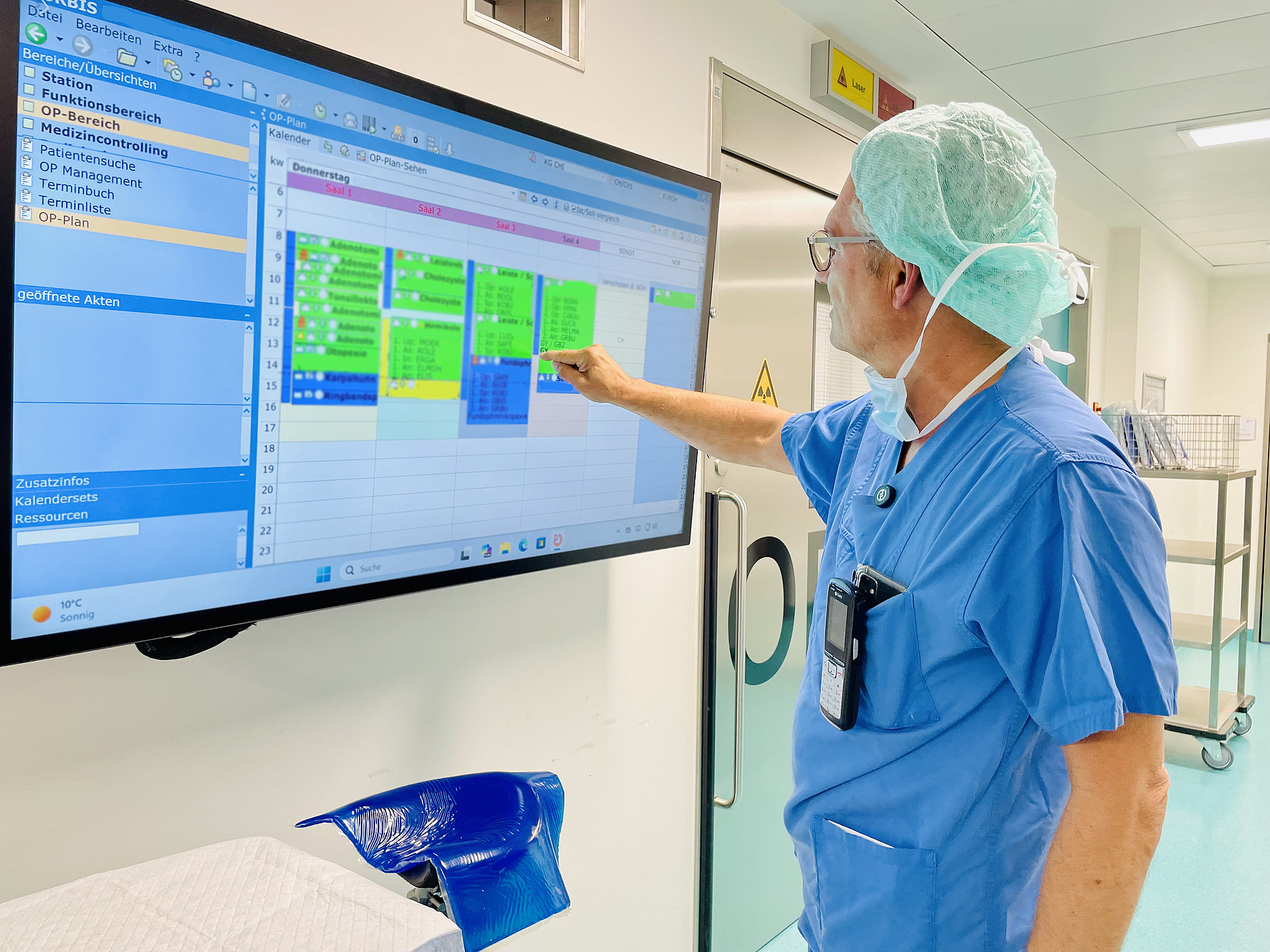 Lotze sorgt dafür, dass Teams vollständig sind, Pausen eingehalten werden und OP-Kapazitäten effizient ausgelastet sind. Er terminiert die einzelnen Eingriffe und Nachmeldungen, hat im Blick, dass die sogenannten Instrumentensiebe, die benötigten Implantate und das medizinische Zubehör für die jeweilige Operation bereitstehen. Klemmt eine OP-Tür oder besteht anderweitig Bedarf an Reparatur oder Wartung, geht Lotze in den Austausch mit dem Technischen Dienst oder der Medizintechnik am Marienstift. Auch das fällt in seinen Aufgabenbereich. Gemeinsam mit dem Teamleiter des Operationsbereichs und dem Chefarzt der Anästhesie bildet er ein eingespieltes Trio: Sie behalten Abläufe und Ressourcen im Blick und stehen in engem Kontakt mit den Kolleg:innen in den Sälen. Welche Eingriffe stehen an, gibt es Besonderheiten oder Engpässe? Danach wird das Personal auf die Säle verteilt – Chirurgie, Gynäkologie, plastisch, ästhetische und Handchirurgie, Orthopädie und HNO. „Unser Ziel ist, den Tag so effizient wie möglich zu gestalten“, sagt Lotze. Und dabei spielen viele Faktoren eine Rolle.