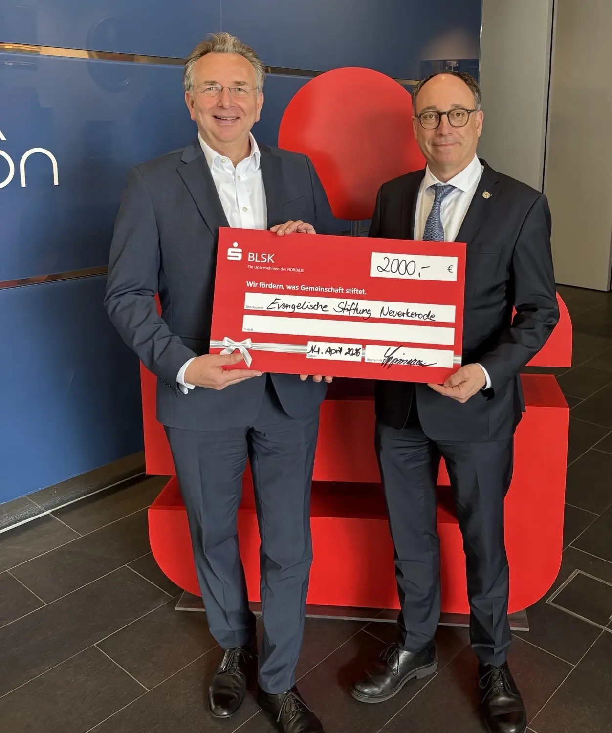 Dr. Ingo Lippmann, Vorstandsvorsitzender der Braunschweigischen Landessparkasse, übergab einen Spendenscheck in Höhe von 2.000 Euro an Tobias Henkel, Vorstandsvorsitzender des Unternehmensverbundes Evangelische Stiftung Neuerkerode (esn), zu dem auch die WuB gehört. Das Geld fließt in die Anschaffung neuer Spielgeräte für den Spielplatz.