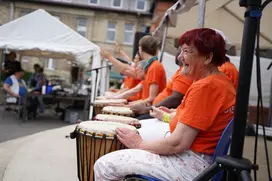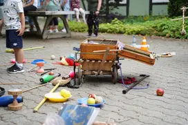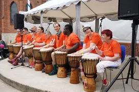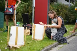 Das große Donnern kam an diesem Tag mal nicht vom Wetter, sondern von der Trommelgruppe der Musikpädagogik. Die bezogen – mit Eimern und Trommelsticks ausgerüstet – am Dorfeingang Stellung und empfingen mit rhythmischen Klängen.