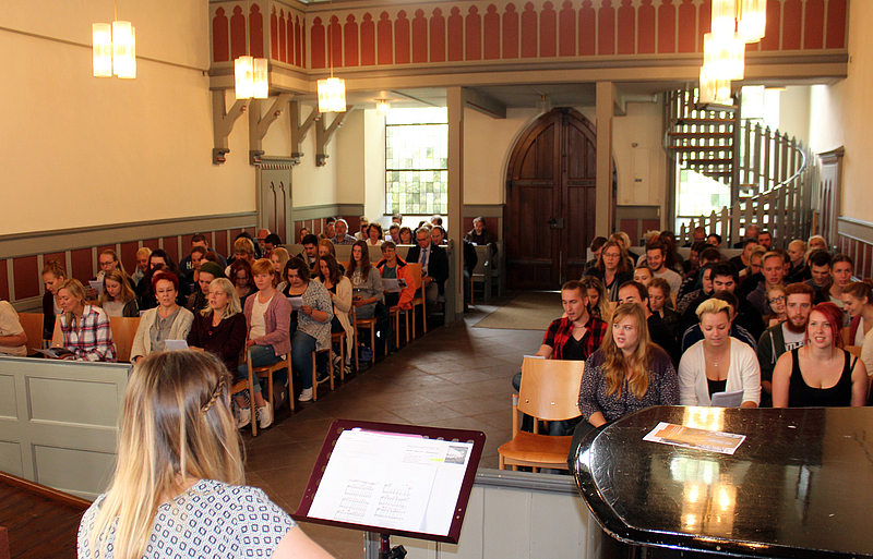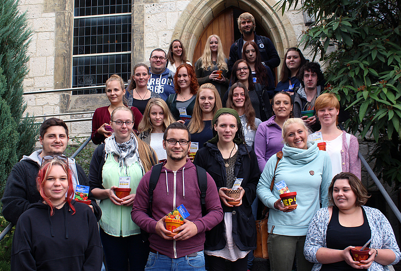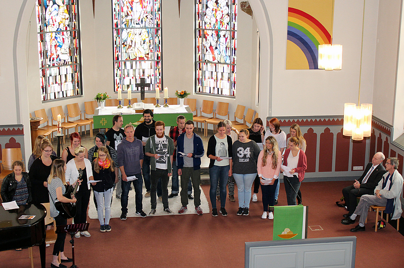 Die Peter und Paul Kirche Neuerkerodes war voll junger Menschen: Schülerinnen und Schüler der Neuerkeröder Fachschule für Heilerziehungspflege begrüßten zusammen mit vielen Neuerkerödern die neuen Fachschüler des Kurses HEP 41. Sie erhielten jeder integrativ ein Geschenk von ihrem Vorgängerkurs und ein eigens für diesen Tag getextetes Lied (mittleres Foto)