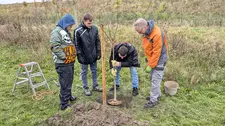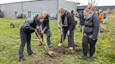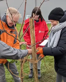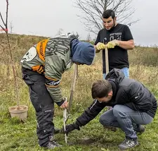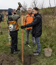 Und zwar wurde angepackt: Beschäftigte und Mitarbeitende der Mehrwerk sowie sieben Mitarbeitende der Funke Medien-Gruppe pflanzten auf dem Werkstatt-Gelände eine Reihe von Obstbäumen. Ohne Barrieren und Berührungsängste ging es ans Werk: In Teamarbeit wurden reihenweise Löcher ausgehoben, Stützpfähle eingeschlagen, Mäusedraht geschnitten und um die Wurzeln gelegt und schließlich die Obstbäume passend eingepflanzt. Sie sollen später die Grundlage für eine Streuobstwiese bilden.