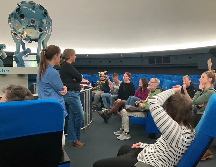 Alle zehn Ensemblemitglieder waren dabei – viele zum ersten Mal überhaupt in einem Planetarium. Die Aufregung war groß, das Staunen noch größer. Eileen Pollex, Geschäftsführerin des Planetariums, und Dr. Julia Lanz-Kröchert, Planetologin und Wissenschaftlerin, nahmen die Gruppe herzlich in Empfang und gaben eine faszinierende Einführung: Gemeinsam wurde das Potenzial der Sternentechnik erkundet – inklusive einer Reise zu den Planeten und einem Spaziergang auf dem Mond. Es war ein Erlebnis, das inspiriert, beflügelt – und die Fantasie für das kommende Theaterstück regelrecht angefeuert hat.