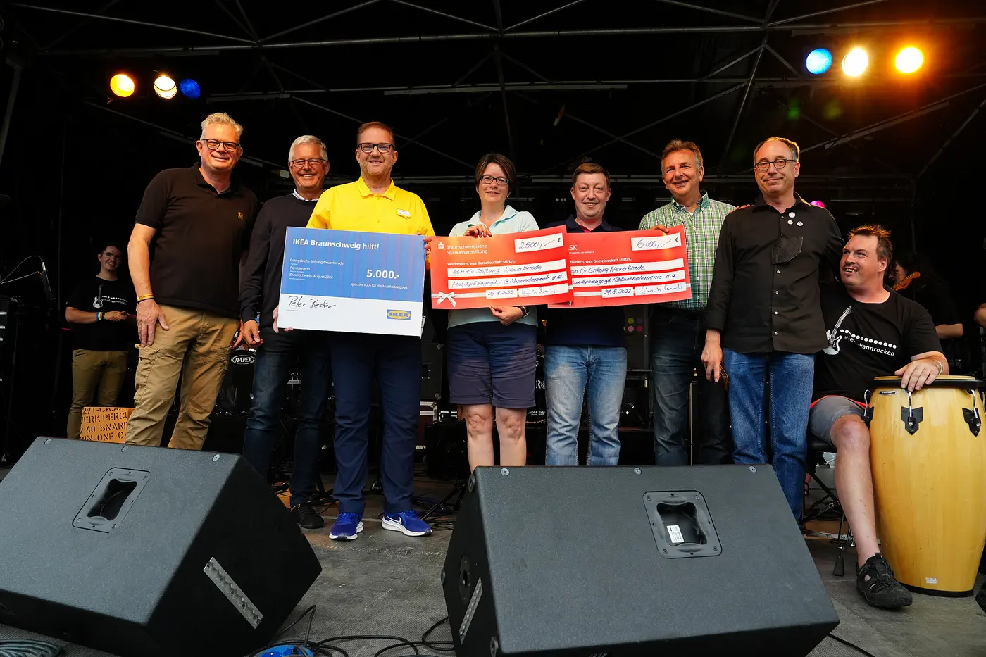 Das „Rock an der Wabe“-Festival 2022 wurde mit einem besonderen Highlight eröffnet: Der Neuerkeröder Musikpädagogik wurden Spendenschecks von der Braunschweigischen Landessparkasse BLSK (6.000 Euro), der Braunschweigischen Sparkassenstiftung (2.500 Euro) und IKEA (5.000 Euro) überreicht. Verwendet werden diese Gelder für die Anschaffung von Bühnenpodesten sowie Lichttechnik. Zuvor sorgte die BLSK bereits bei vielen Wohngruppen in Neuerkerode für Freude, weil der jährliche Soziale Tag gemeinsam in dem inklusiven Dorf verbracht wurde. Über 20 Führungskräfte tauschten nun bereits zum achten Mal ihre Bürokleidung gegen Malerhose, Kochschürze und Gartenhandschuhe, um das Alltagsleben im Dorf zu unterstützen und zu verschönern. „Das gesamte BLSK-Team hat eine großartige Zeit mit den Bürgerinnen und Bürgern verbracht“, schwärmte Christoph Schulz, Vorstandsvorsitzender von Braunschweigischer Landessparkasse und Sparkassenstiftung. „Besonders freue ich mich, dass wir mit der Spende, die ich sowohl für die BLSK als auch für unsere Stiftung überreichen darf, die wunderbaren Musikprojekte in Neuerkerode unterstützen können."