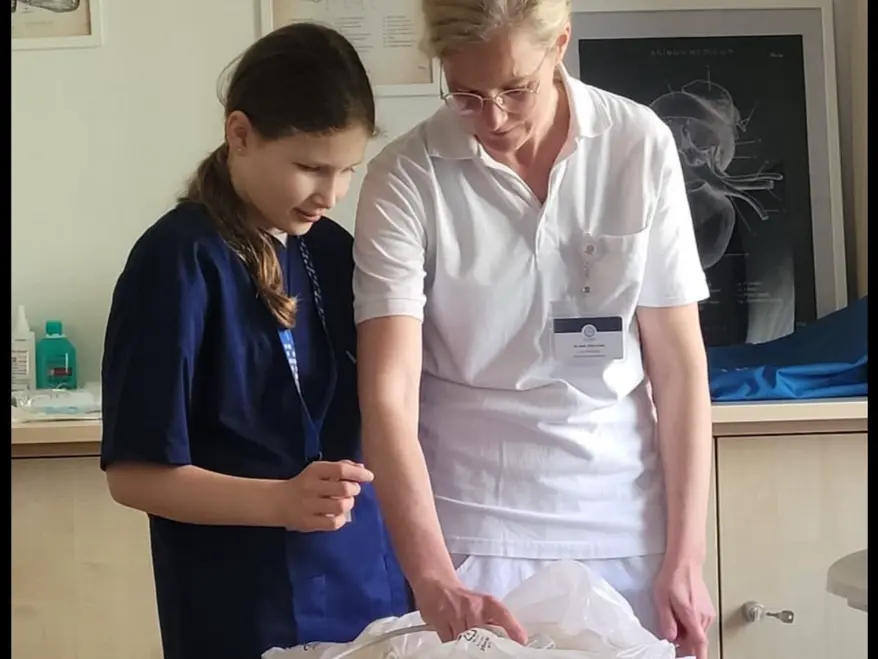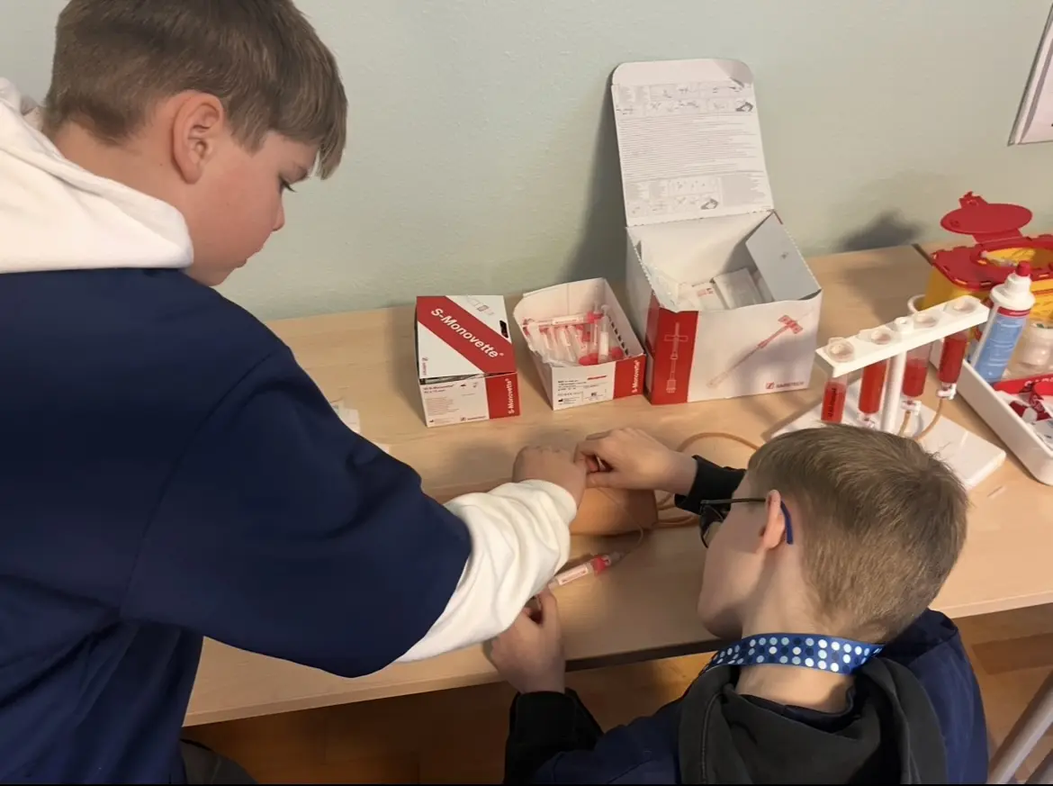 „Ein Tag im Krankenhaus“ hieß das Motto für 21 Kinder im Krankenhaus Marienstift. Dabei wurde nicht nur zugeschaut, sondern aktiv mitgemacht. In der Endoskopie konnten versteckte Süßigkeiten geborgen werden und beim Ultraschall wurde ein Blick ins Innere von Wackelpudding geworfen, denn auch dort war etwas versteckt. Weitere Stationen führten in den Kreißsaal, die Entbindungsstation und die Physiotherapie. Besonders spannend waren auch das Blutdruckmessen, EKG-Schreiben, das Üben der Blutabnahme am Trainingsarm sowie die richtige Händedesinfektion. Nach einem gemeinsamen Mittagessen und einem Quiz zum Abschluss gingen die Schüler:innen mit vielen neuen Eindrücken nach Hause.