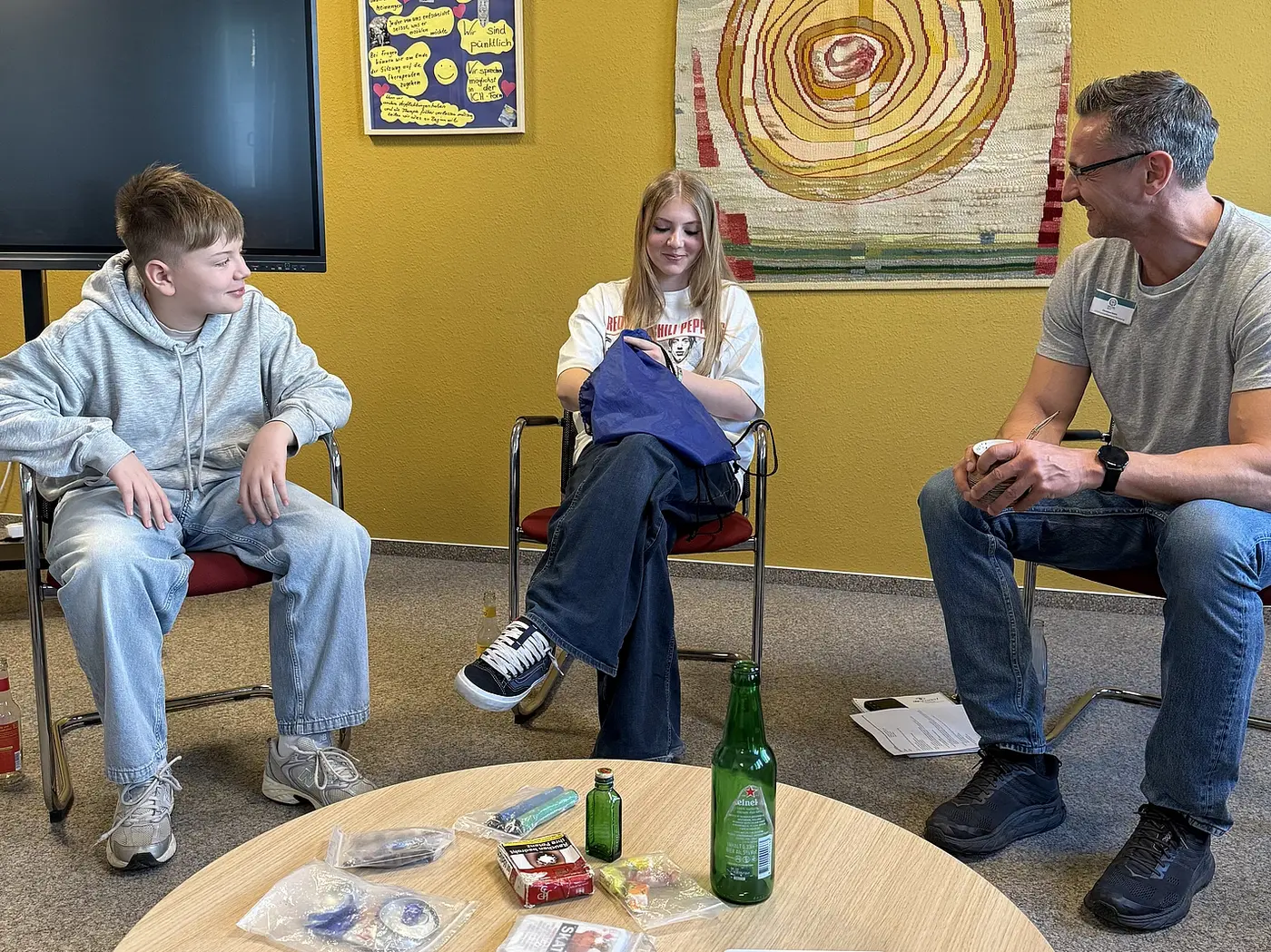 Sechs Schüler:innen aus den Jahrgangsstufen sechs bis neun waren in der Fachambulanz in Braunschweig des Lukas-Werks zu Besuch. Ziel war es, die Suchthilfe im Lukas-Werk mit den verschiedenen Arbeitsbereichen kennenzulernen und gleichzeitig Hintergrundinformationen zum Thema Sucht zu vermitteln. Gemeinsam wurde erarbeitet, welche Faktoren Sucht begünstigen können und welche im Lukas-Werk behandelt werden. Außerdem wurde unter anderem mit dem „grünen Koffer“ gearbeitet, einem Methodenset zur Cannabisprävention mit interaktiven Bausteinen, um mit jungen Menschen über Cannabis ins Gespräch zu kommen und sie zu einer risikobewussten Auseinandersetzung mit dem Thema zu sensibilisieren.